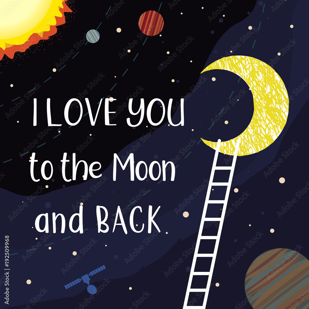 Romantic Poster Cute Cartoon Inspirational Quote Fancy Outer Space Stars In Dark Sky Motivation Phrase Love You To The Moon Vector Valentine Day Greeting Card Template Lovers Weeding Banner Stock Vector
